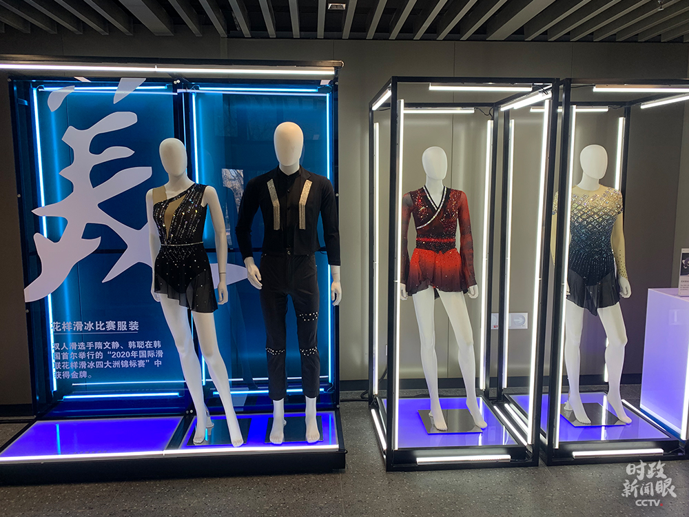△左邊是花樣滑冰雙人滑選手隋文靜、韓聰的比賽服,兩位選手在“2020年國際滑聯花樣滑冰四大洲錦標賽”中奪冠。(總枱央視記者範一鳴拍攝)