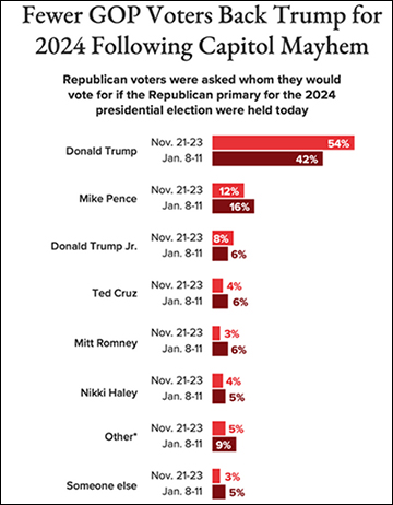 不過民調機構“早間諮詢”13日發佈的報告指出,國會騷亂事件確實對特朗普的支持率造成了沉重打擊,但他在共和黨選民中依然佔據主導地位。受訪者的共和黨選民中,有42%支持特朗普於2024年再度競選總統,這比去年11月下降了12個百分點,不過依舊遠超其他潛在的共和黨候選人。