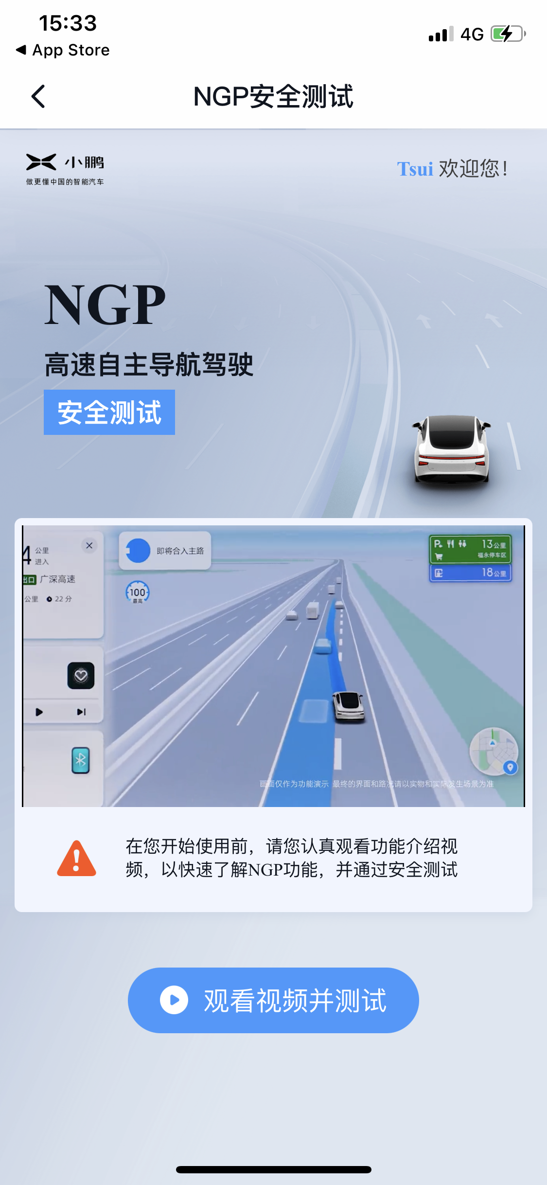 而本次試駕活動,以廣州花都木蓮莊酒店為起點,全長95km,途徑城市擁堵路段、高速、隧道等。與以往的體驗不同的是,參與此次體驗的所有人在試駕前都要先“考試”——先觀看一段長達四分鐘的NGP安全提示視頻,只有通過安全考試才能獲得打開NGP的權限。