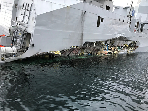 2018年11月8日,“黑爾格·英斯塔”號與馬耳他籍油輪“索拉TS”號相撞,導致右舷嚴重受損、船體大幅度傾斜,該艦最後搶灘擱淺在挪威西海岸上。幾天後由於固定軍艦的鋼索斷裂,該艦迅速沉沒。
