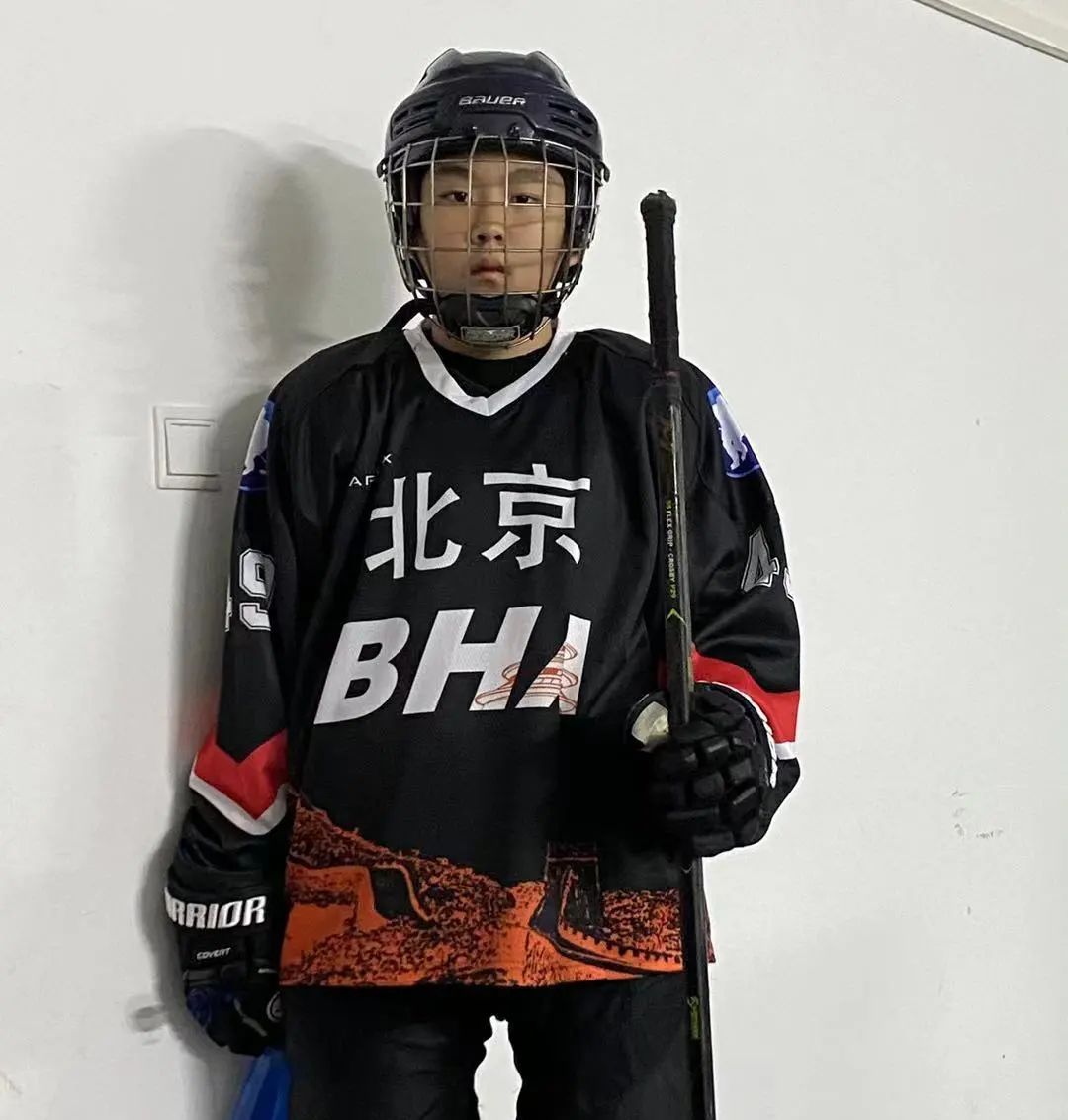 官子釗入選北京市青少年冰球隊後身着隊服照片