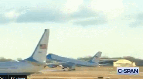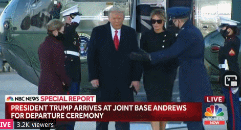 8點13分左右,特朗普和妻子梅拉尼婭走出白宮,登上“海軍陸戰隊一號”直升機前往安德魯斯聯合基地。在那裏,特朗普將在乘坐“空軍一號”前往佛羅里達前,舉行一場簡短的告別活動。CNN記者柯林斯(Kaitlan Collins)在推特上説,特朗普比計劃離開白宮的時間,晚了半小時。