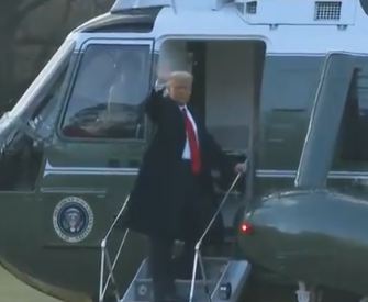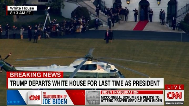 8點13分左右,特朗普和妻子梅拉尼婭走出白宮,登上“海軍陸戰隊一號”直升機前往安德魯斯聯合基地。在那裏,特朗普將在乘坐“空軍一號”前往佛羅里達前,舉行一場簡短的告別活動。CNN記者柯林斯(Kaitlan Collins)在推特上説,特朗普比計劃離開白宮的時間,晚了半小時。