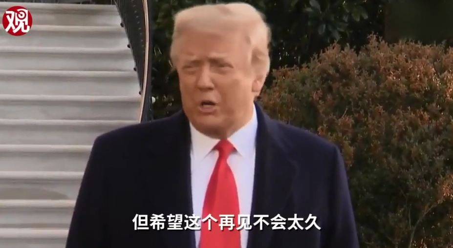 登機前的最後一句話,特朗普説:“再見。我們愛你。我們會以某種形式回來……祝你生活愉快。我們很快會再見面的。”