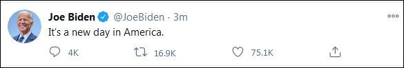 在飛機起飛後不久,即將參加就職典禮的拜登發了一則推特:這是美國新的一天。