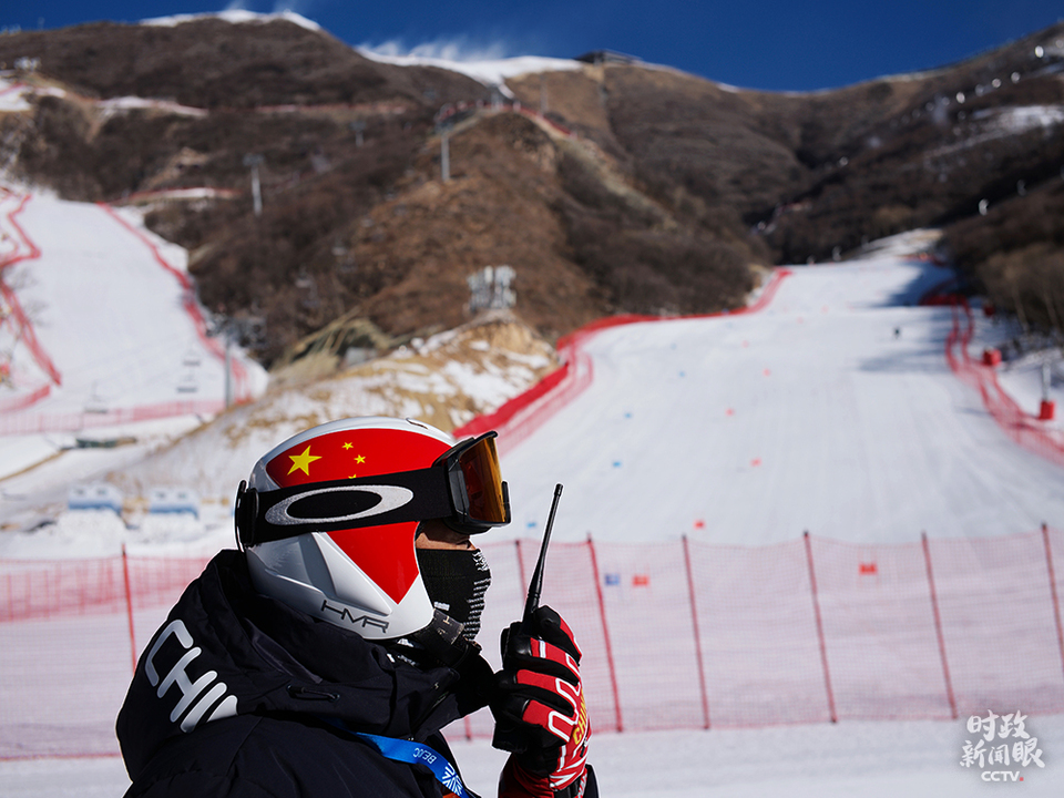 △延慶賽區高山滑雪中心,為完成賽道造雪任務,山地運行團隊前後投入150餘台造雪機,27台壓雪車24小時不間斷作業。這是山地運行負責人吳高勝在指揮工作。(總枱央視記者王哈男拍攝)