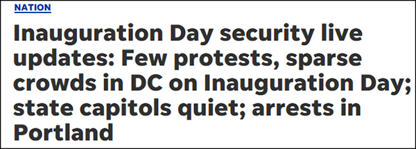 《今日美國報》稱,在這樣的嚴密把守之下,整個就職典禮期間華盛頓並未發生任何示威活動,“街道靜悄悄的”。報道提到,國會大廈街對面的美國最高法院一度收到炸彈威脅,但國民警衞隊在搜查後證實這是個“騙局”。