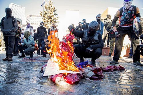 在丹佛市,一羣打着“反法西斯主義運動”旗號的示威者聚集在公園及科羅拉多州州議會門外,沿周邊街道發起遊行。他們抗議拜登就職、警察暴力等問題,並宣稱要為美國的非裔、拉丁裔和原住民爭取平等權利。當天下午,一些示威者在州議會外焚燒美國國旗,期間還曾與試圖滅火的民眾發生衝突。