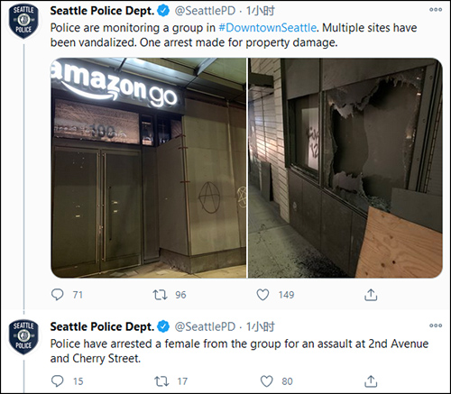 西雅圖則有150名示威者高舉橫幅開始遊行,橫幅上寫着“不要警察,不要監獄,不要邊境,不要總統”等口號。他們在路邊噴塗無政府主義標誌,並砸碎了一些玻璃。根據西雅圖警方發佈的消息,他們一直在跟隨並監控示威者人羣。已有至少兩人因破壞或襲擊行為被捕。