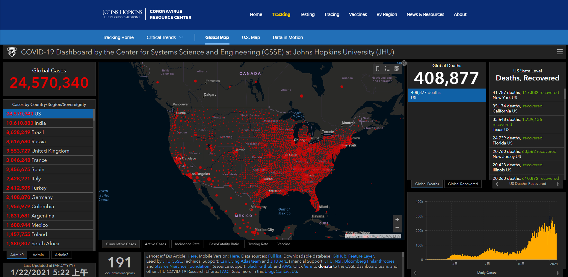 (觀察者網訊)根據美國約翰斯·霍普金斯大學統計的數據,截至北京時間2021年1月22日5時22分,美國新冠肺炎確診病例總數24570340例,死亡病例總數達到408877例。在過去約24小時裏,美國新增確診病例188029例,新增死亡病例3979例。