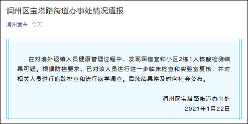 江蘇省鎮江市潤州區委宣傳部微信公眾號“潤州發佈”1月22日消息,在對境外返鎮人員健康管理過程中,發現國信宜和小區2棟1人核酸檢測結果可疑。根據防控要求,已對該人員進行進一步臨牀檢查和實驗室複核,並對相關人員進行追蹤排查和流行病學調查。後續結果將及時向社會公佈。