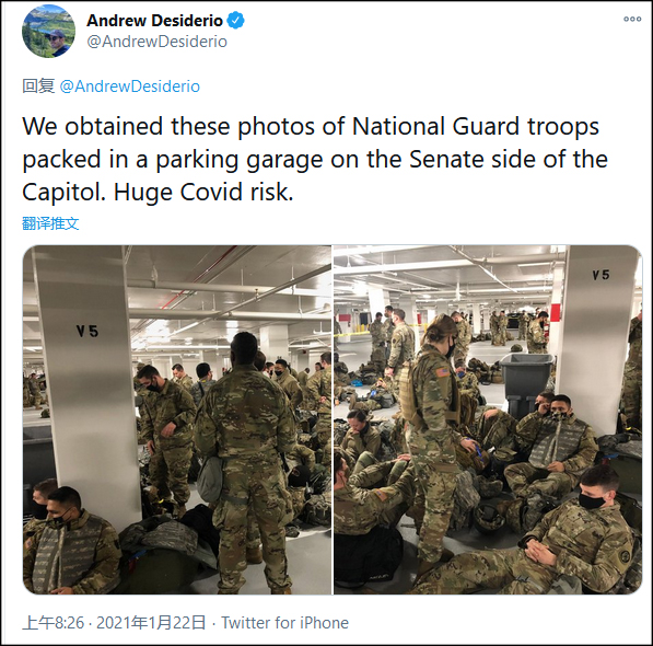 儘管國民警衞隊已經要求士兵除吃喝外隨時佩戴口罩,但在嚴峻的疫情期間,如此多的人被迫擠在一個缺乏洗手間的狹小空間內,這不能不讓士兵們感到憂慮。