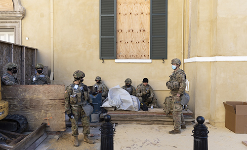 拜登就職典禮期間,共有25000多名美國國民警衞隊士兵駐守華盛頓特區,負責確保典禮安全。在森嚴的戒備下,20日當天出現在華盛頓街頭的抗議者寥寥無幾,拜登的就職典禮“有驚無險”地順利結束。