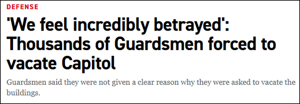 “任務與目標”網站稱,這種惡劣的待遇已經激怒了一些國民警衞隊士兵。一名害怕遭到報復而匿名的軍人憤怒地表示:“太糟糕了,這表明了那些政客對國民警衞隊的真正看法……我們離開家人在這裏駐守了兩週,這當然很重要,也是歷史性的。但就職典禮後的第二天你就把我們一腳踢到路邊了?你可真行啊。”