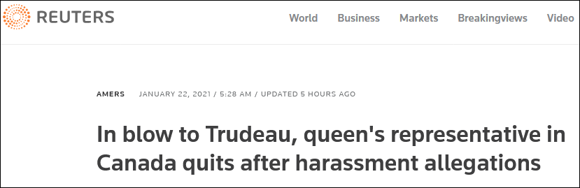 綜合路透社及加媒《多倫多太陽報》(Toronto Sun)等報道,加拿大總督帕耶特21日遞交辭呈之際,正值當天一份針對她涉嫌霸凌下屬的調查報告發布。這份調查報告顯示,她所在的總督府的工作氛圍確實“有毒”。