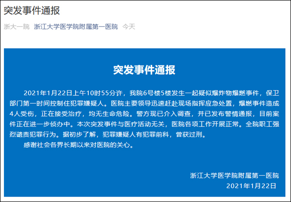 2021年1月22日上午10時55分許,我院6號樓5樓發生一起疑似爆炸物爆燃事件,保衞部門第一時間控制住犯罪嫌疑人。醫院主要領導迅速趕赴現場指揮應急處置,爆燃事件造成4人受傷,正在接受治療,均無生命危險。警方現已介入調查,並已發佈警情通報,目前案件正在進一步偵辦中。本次突發事件與醫療活動無關,醫院各項工作開展正常。全院職工強烈譴責犯罪行為。據初步瞭解,犯罪嫌疑人有犯罪前科,曾獲過刑。