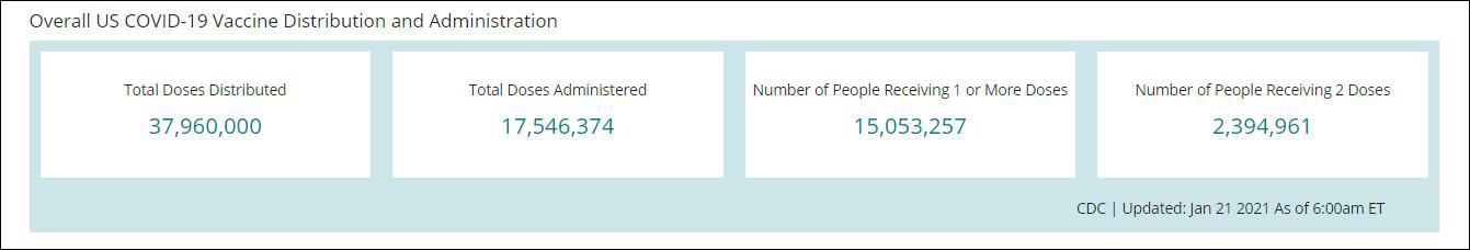 美國疾控中心(CDC)數據顯示,截至1月21日,美國聯邦政府已經向州和地方政府分發了3796萬劑輝瑞和莫德納疫苗。但全美僅進行了約1754萬次疫苗注射,包括1505萬次首次接種與239萬次二次接種。