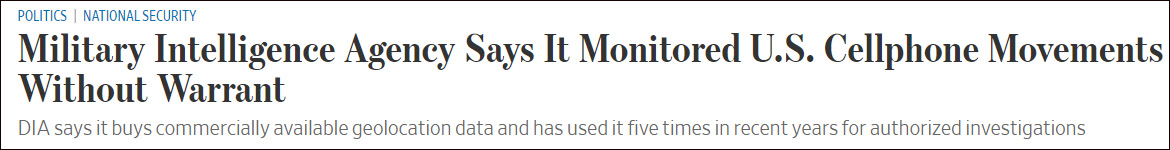 隨着近年來電腦、智能手機和平板電腦的個人數據爆炸式增長,美國其他許多政府機構也表達了和國防情報局類似的立場。比如説,國土安全部正在購買一款類似的數據產品,在未授權的情況下將其用於邊境安全和移民任務;美國國税局也購買了手機數據的權限,將其用於執法任務。這些部門都聲稱,他們的數據是在公開市場的購買的,所以不需要法院的授權。