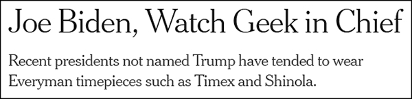 “總統拜登可能會把入主白宮描述成‘讓賓夕法尼亞大道1600號(白宮所在地)恢復正常’,但他至少已經打破了一項美國總統間盛行的傳統:他戴了一塊勞力士手錶。”《紐約時報》寫道。