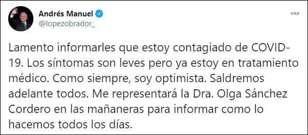 墨西哥總統稱自己確診新冠肺炎 截圖:推特