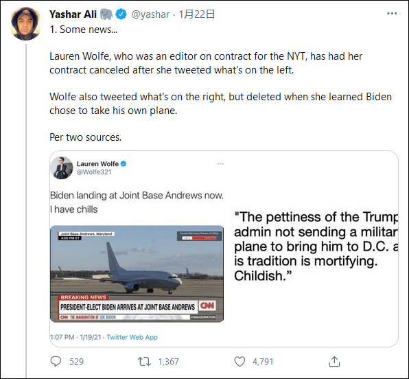 引發一連串事件的這名《紐約時報》編輯名叫勞倫·沃爾夫(Lauren Wolfe),上週二(1月19日)拜登前往華盛頓正式就職時,她發佈了一張飛機降落的照片,並寫道:“拜登現在降落在了安德魯斯空軍基地,我激動到發抖。”