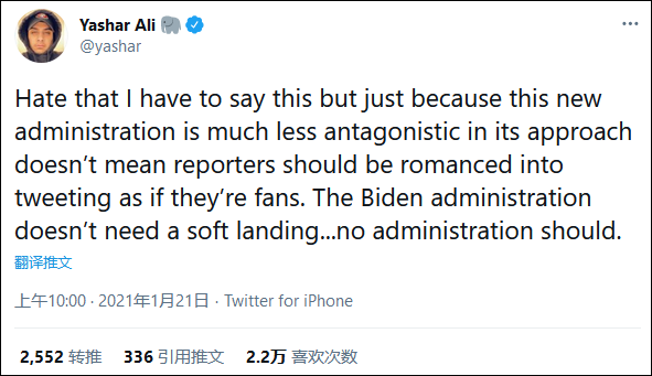 而那位最初爆料的記者阿里1月21日則在推特上感嘆,自己對新一屆政府喜歡不起來。“就算新政府在許多問題的處理方式上少了對抗性,但記者們也不該用各種誇張、渲染手法任意發推文,搞得好像自己是腦殘粉一樣。拜登政府不需要這種‘軟着陸’(媒體替特定政府説好話),任何政府都不應該需要。”
