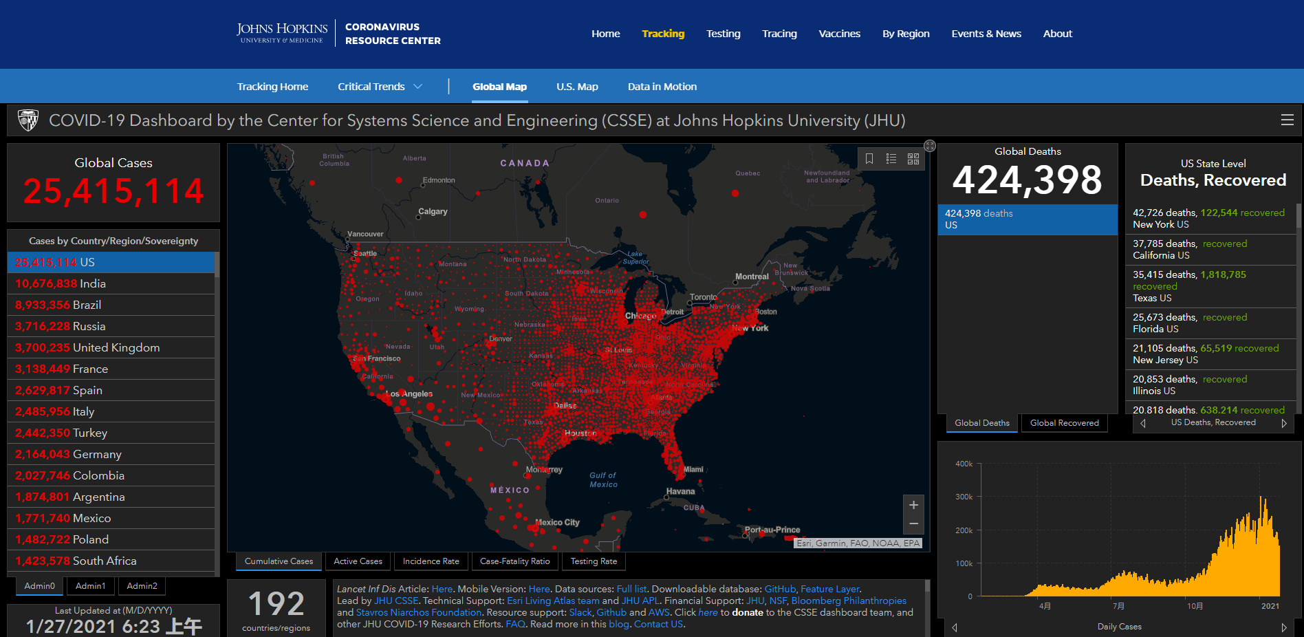 (觀察者網訊)根據美國約翰斯·霍普金斯大學統計的數據,截至北京時間2021年1月27日6時23分,美國新冠肺炎確診病例總數25415114例,死亡病例總數達到424398例。在過去約24小時裏,美國新增確診病例168401例,新增死亡病例3675例。