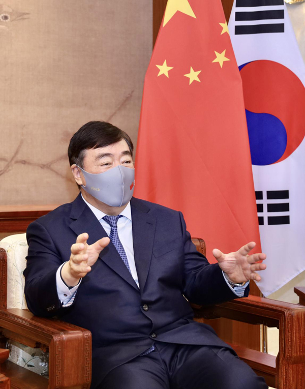 答:我在新冠疫情暴發初期履新,時間特殊,使命重大。疫情雖然給我去年的工作帶來了不少困難,但通過積極創新、主動作為,也取得了不少成果。在前後方共同努力下,去年習近平主席同文在寅總統2次通話,在國際舞台保持積極互動,為雙邊關係發展、國際多邊合作引航定向。我們克服了疫情的重重困難,成功接待中共中央政治局委員、中央外辦主任楊潔篪來韓磋商,圓滿完成王毅國務委員兼外長訪韓任務,順利實施第七批在韓中國人民志願軍烈士遺骸交接工作。這些“面對面外交”在疫情大背景下尤為難能可貴,雙方還通過靈活多樣的形式在經貿、人文、地方等領域保持活躍往來,給中韓關係帶來了新動力、新活力。最大的成果可以説是中韓雙方深入推進抗疫合作。兩國面對疫情同舟共濟、守望相助,率先建立雙邊聯防聯控合作機制、率先建立便利重要急需人員往來的“快捷通道”、率先開展復工復產合作,在國際上樹立了一系列典範。