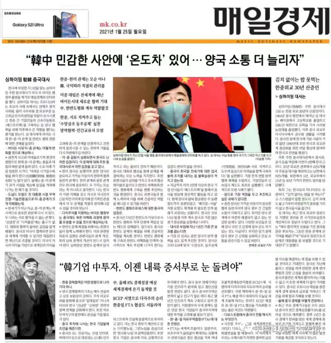 中國駐韓國大使館網站1月26日消息,1月25日,韓國《每日經濟新聞》刊登邢海明大使專訪。邢海明大使在訪談中回顧了過去一年來中國經濟社會建設取得的成就,展望後疫情時代中韓經貿合作及兩國關係發展光明前景,就中國“十四五”規劃、中美關係等回答了記者提問,並介紹了習近平主席即將以視頻方式出席世界經濟論壇“達沃斯議程”對話會並發表特別緻辭有關情況。