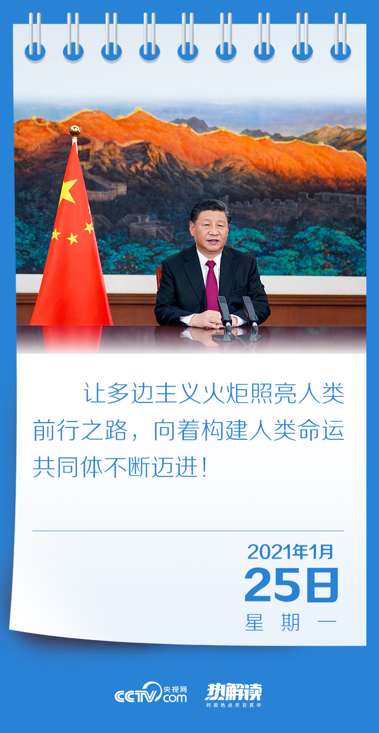 1月25日晚,習近平主席在北京以視頻方式應邀出席世界經濟論壇“達沃斯議程”對話會,並發表題為《讓多邊主義的火炬照亮人類前行之路》的特別緻辭。