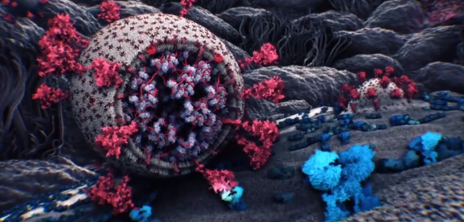 由清華大學團隊同奧地利、沙特團隊合作製作的新冠病毒3D高清科普影像截圖