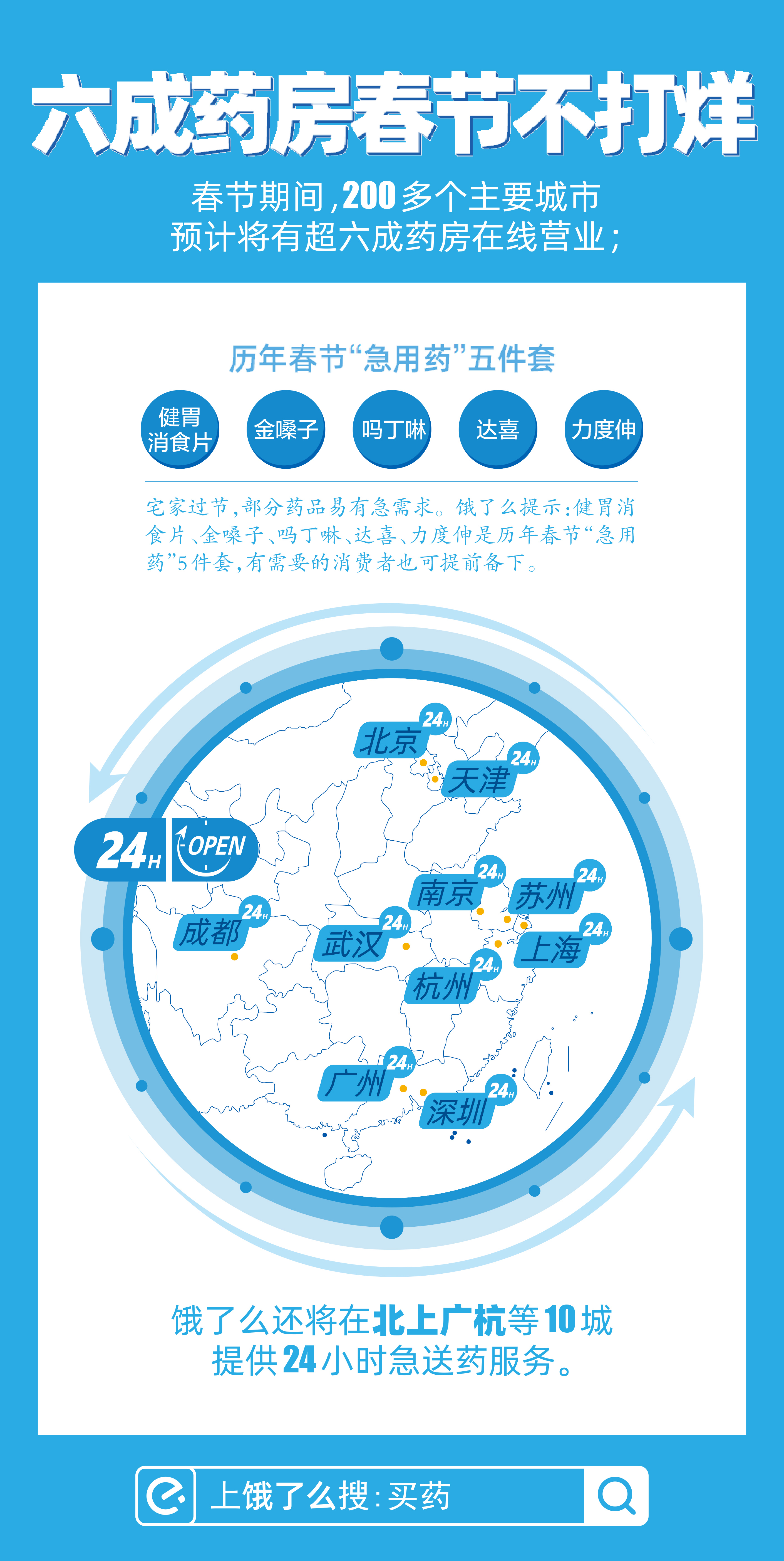 超六成藥房春節在線營業,餓了麼多城提供24小時急送藥服務