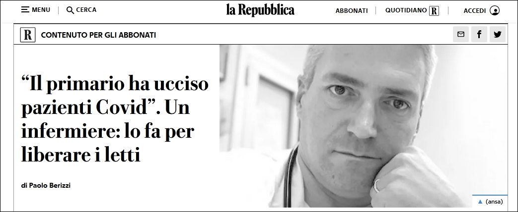 意大利《共和報》:“主治醫師殺死了新冠肺炎患者”。護士:他這樣做是為了騰出牀位