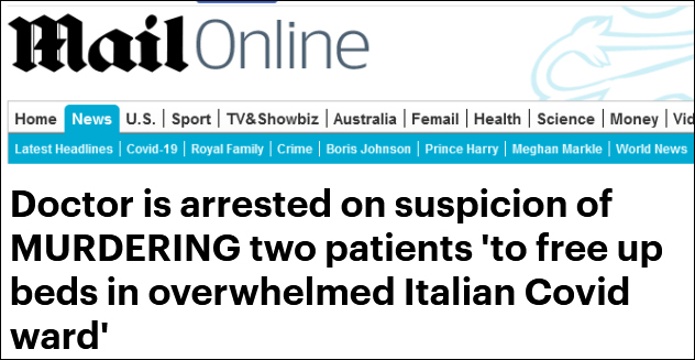 英國《每日郵報》:意大利一名醫生因涉嫌謀殺兩名患者被捕,目的是為不堪重負的新冠病房騰出牀位