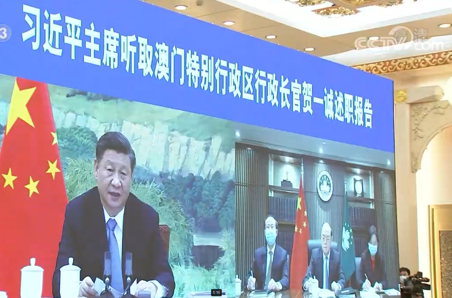 央視新聞客户端同日還報道稱,國家主席習近平27日下午在北京以視頻連線方式聽取了澳門特別行政區行政長官賀一誠2020年度的述職報告。賀一誠彙報了澳門特別行政區政府過去一年工作和當前形勢。