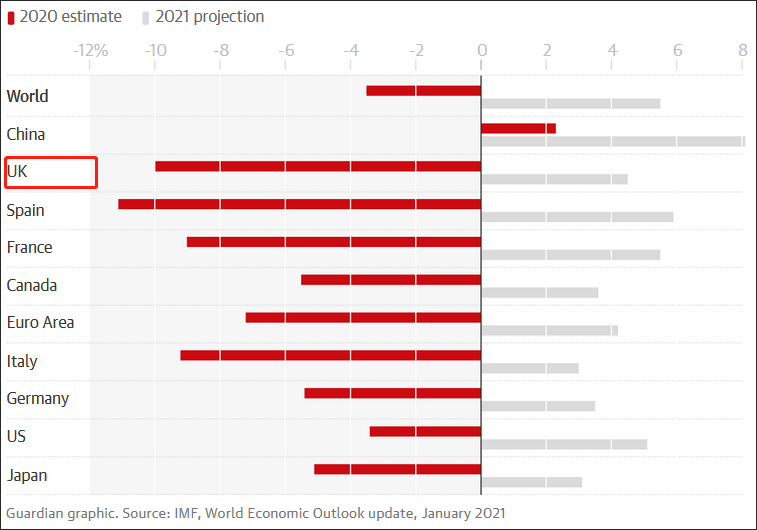《衞報》26日稱,**國際貨幣基金組織(IMF)下調了2021年英國經濟增長預測至4.5%。這一數據較去年10月預測的5.9%下降了1.4個百分點。**IMF還預測,英國經濟要到2022年才能恢復到疫情前的水平。英國政府預算責任辦公室此前預計,在達成脱歐協議的情況下,英國經濟15年內也將比留在歐盟萎縮4%。
