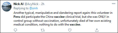 有人表示:這就是媒體是如何通過在標題中遺漏元素撒謊的。路透社説注射中國疫苗的實驗者死亡,但在內文中才提到這個人注射的是安慰劑。寫這篇文章只是為了妖魔化中國。
