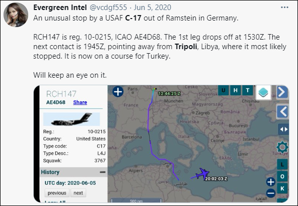 去年6月,網民注意到一架美國空軍C17運輸機從德國飛往利比亞 圖自:社交媒體