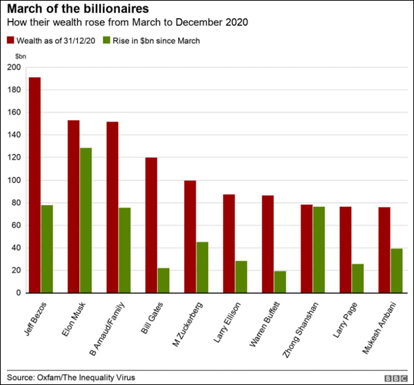 自2020年3月以來,**全世界10大億萬富豪的總財富增加了5400億美元,這個數字足以為支付世界上所有人接種疫苗的開支,並且可以讓全球人口免於因疫情而陷入的貧困。**在這10人之中,包括特斯拉創辦人馬斯克、亞馬遜的創辦人貝索斯、臉書創辦人扎克伯格等科技業知名人物。