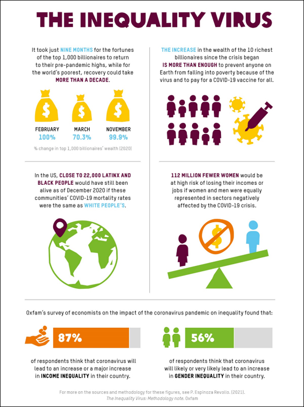 報告顯示,疫情爆發後全世界有2至5億人口生活在貧窮狀態下,並且在這個世界上,近一半的人口每天靠着不足5.50美元的生活費勉強度日。對於全球前1000名億萬富翁來説,這場疫情帶來的財富損失,僅用9個月的時間就可以恢復到疫情前的水平,相反,對於那些生活在貧困中的人們可能需要花上10年,甚至更久的時間才能恢復疫情前的經濟水平。