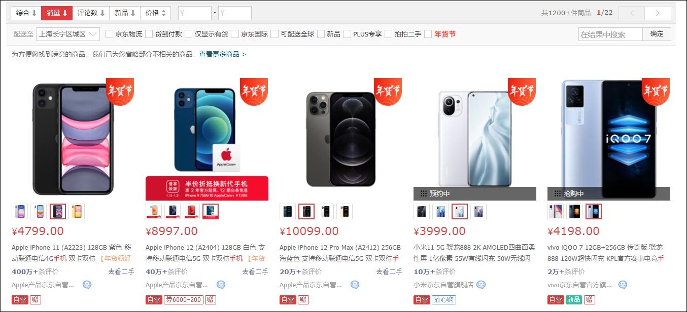 觀察者網查詢某電商平台發現,以銷量排序,目前最高機型是iPhone 11,累計評論數達到400萬+;其次是iPhone 12,評論數達到40萬+;隨後是iPhone 12 Pro Max、小米11、vivo iQOO 7。