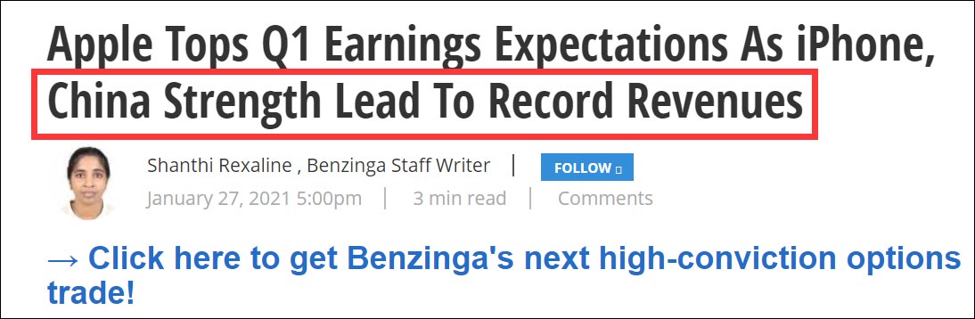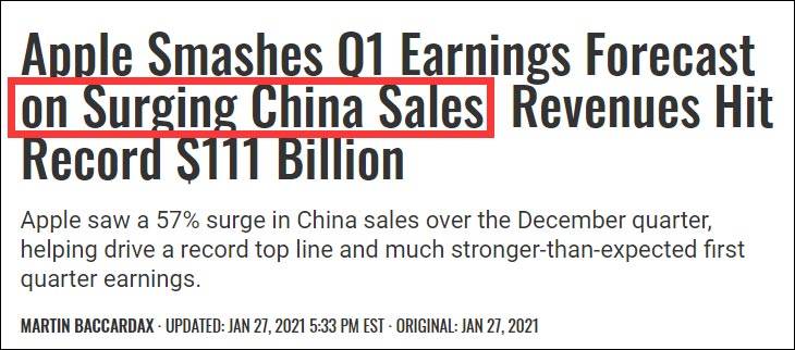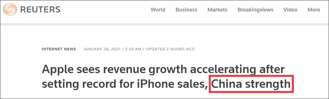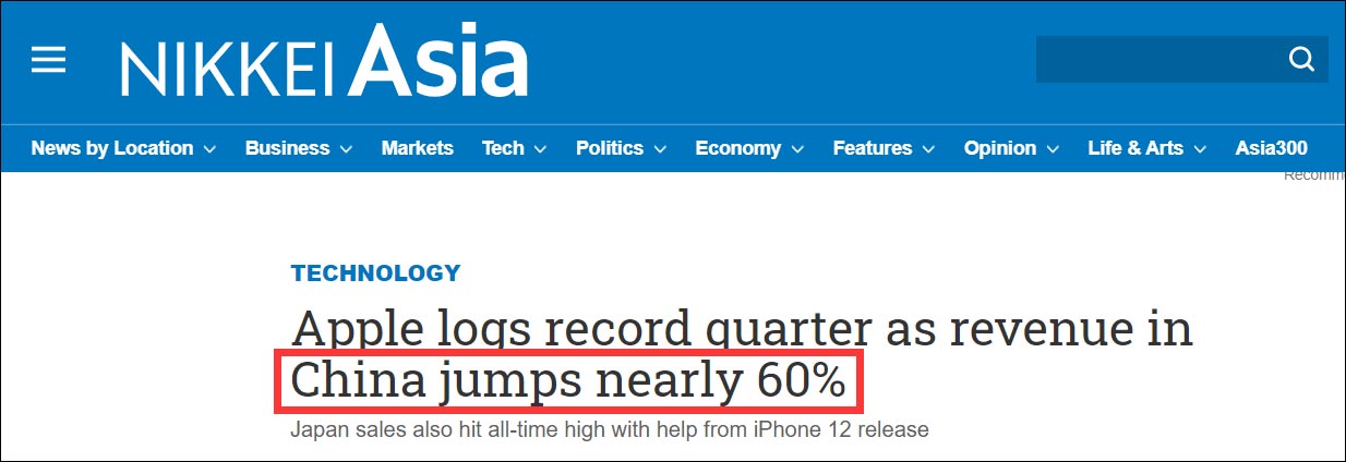 蘋果財報發佈後,包括路透社、日經亞洲評論、美國財經媒體“Benzinga”、華爾街知名財經媒體“The Street”等外媒在報道時紛紛把“中國”放在標題中,並指出蘋果營收創紀錄得益於其首款5G iPhone在中國市場的強勁銷售。