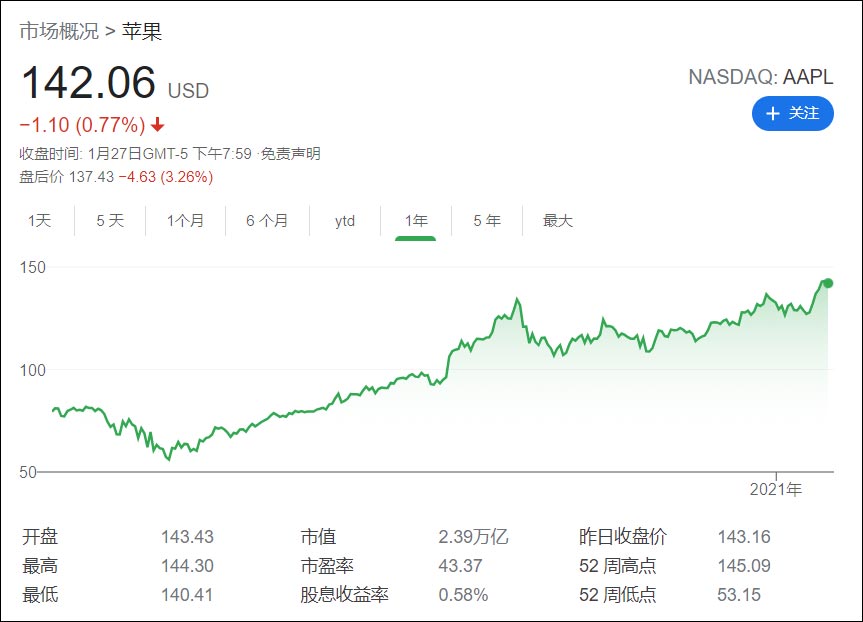 儘管單季度營收創紀錄,蘋果股價在週三盤後交易中仍下跌超過3%,目前市值為2.39萬億美元。此前該公司表示,將不會為未來幾個季度提供指導,理由是與新冠疫情相關的不確定性。