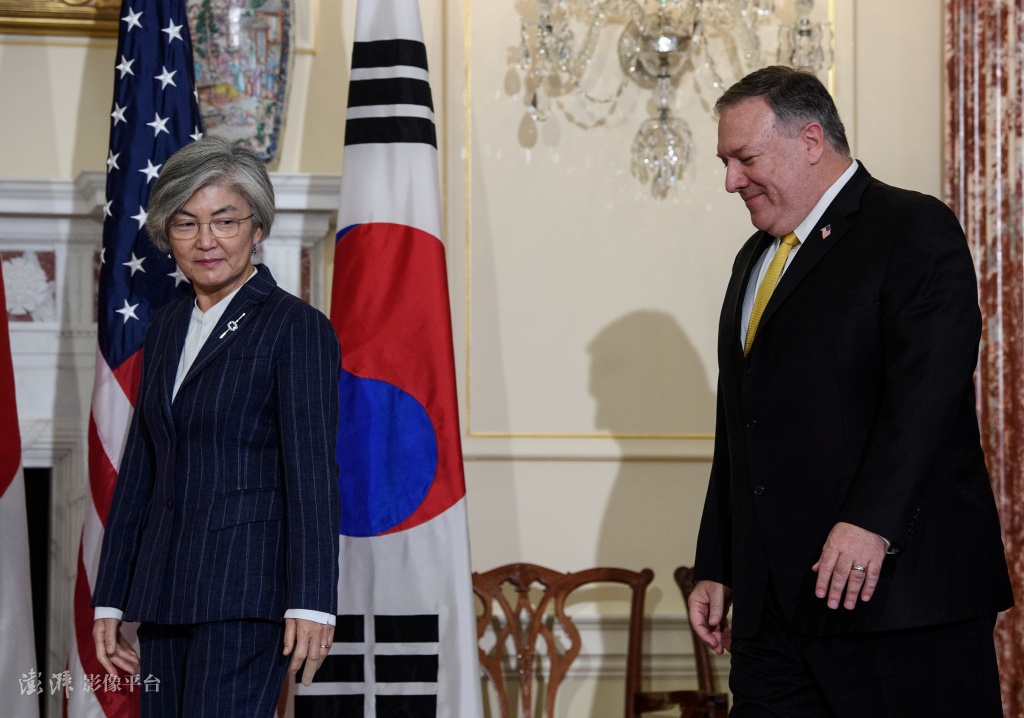 2020年11月9日,美國國務卿蓬佩奧和韓國外交部長康京和在美國國務院舉行雙邊會談前合影。圖自澎湃影像