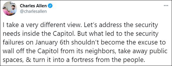 此外,華盛頓特區議員、公共安全委員會主席查爾斯·艾倫(Charles Allen)表示, 6日的騷亂是可怕的,但同時我們看到了美國國會警察的失敗。如果僅僅是建立一個不可擴展的圍欄,把國會變成一個遠離人民的堡壘,是非常錯誤的。艾倫稱,他已經收到選民的反饋,他們對在圍欄頂部盤繞着的帶刺鐵絲網感到憤怒。