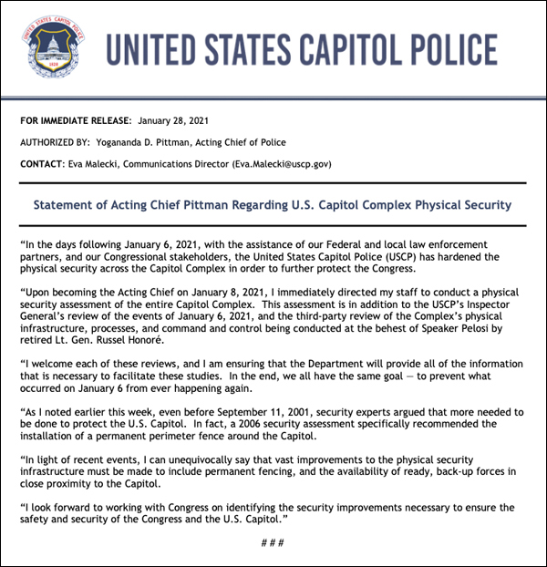 “鑑於最近發生的事件,我可以毫不含糊地説,必須大幅改善有形的安全基礎設施,包括設置永久性的圍欄,以及在國會大廈附近部署隨時待命的後備部隊。”皮特曼在國會騷亂後接管了警察部隊,她在聲明中表示,“我期待着與國會合作,確定必要的安全改進措施,以保障美國國會和國會大廈的安全。”