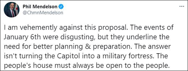 華盛頓特區議會主席菲爾·門德爾松(Phil Mendelson, D)和紐約州共和黨人埃莉斯·斯特法尼克(Elise Stefanik)都在推文中表達了強烈的不滿,他們強調,人民的國會應該永遠向人民敞開大門。