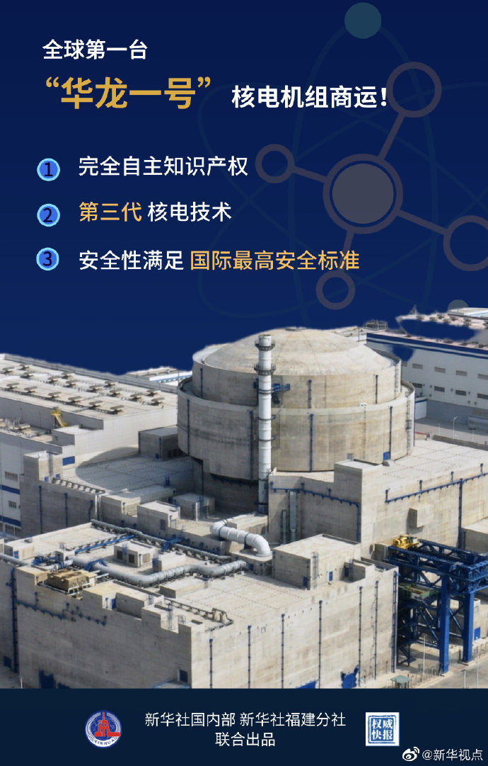 1月30日,全球第一台“華龍一號”核電機組——中核集團福建福清核電5號機組投入商業運行。“華龍一號”是我國具有完全自主知識產權的三代核電技術。我國成為世界為數不多的具備自主三代核電技術的國家。
