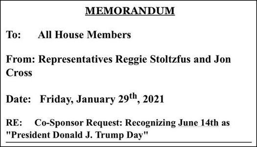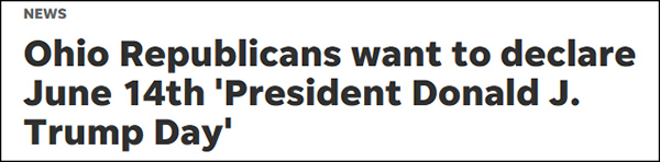 據俄亥俄州媒體《辛辛那提詢問者報》1月29日報道,該州共和黨籍州議員喬恩·克羅斯(Jon Cross)和雷吉·斯托爾茨弗斯(Reggie Stoltzfus)給他們的州議員同僚發了一封郵件,計劃把特朗普的生日6月14日設立為俄亥俄州的“特朗普總統日”,希望能獲得其他州議員的支持。