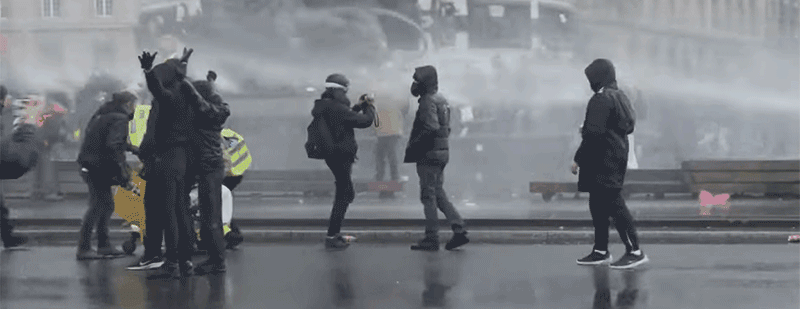 示威很快演變成暴力活動。巴黎的抗議者與警察爆發衝突,隨後警方用高壓水槍清場,共有26人被捕。本次抗議者羣體中,也出現不少“黃背心”運動的參與者。法國總統馬克龍當天呼籲民眾遵守防疫規定,阻止疫情蔓延。
